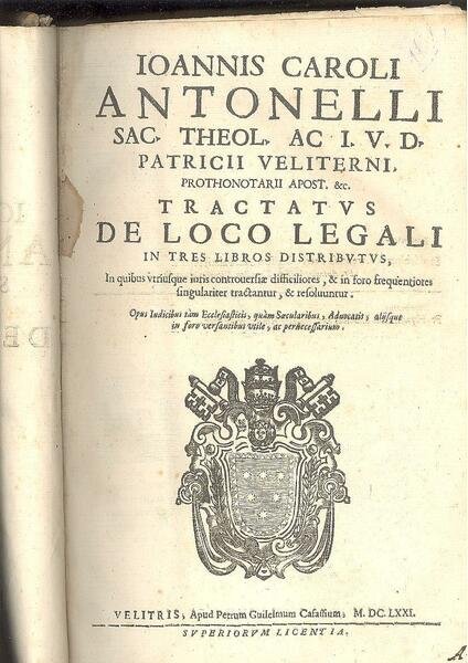 IN FOLIO ( cm.21 X 31 ), pp.( 14 ), 403, ( 61 ). SEGUE PRELOGOMENUM, pp.74 + 1 CON CORNICI LATERALI, FINALINI E CAPILETTERA INC. TESTO SU DUE COLONNE IN LATINO. INIZIALI E TESTATINE XILOGRAFICHE. OCCHIETTO. GRANDE STEMMA DI PAPA CLEMENTE X<BR>( AL SECOLO BONAVENTURA ALTIERI ) AL FRONTESPIZIO. LEGATURA IN PIENA PERGAMENA CON 11 NERVI E TITOLO MANOSCRITTO. TRATTATO DE LOCO LEGALI DISTRIBUITO IN TRE LIBRI. GIOVANNI CARLO ANTONELLI ORIGINARIO DI VELLETRI ( 1612 - 1694 ), FU TRA I COLLABORATORI GIURIDICI DEL CARDINALE ANTONIO BARBERINI FINO A DIVENTARE A SUA VOLTA VESCOVO DI FERENTINO. MINIME MANCANZE AL DORSO,.a pg. 83 MANCANZA DI TESTO NELLA PARTE ESTERNA DEL PIEDE e a c:5 DELL'INDEX. MENTRE, a c 15 e 16,. MANCANZA NELLA PARTE INTERNA IN ALTO SEMPRE DELL'INDEX. ALCUNI ARROSSAMENTI SPARSI DOVUTI AL TIPO DI CARTA. NELL'INSIEME OTTIMA CONSERVAZIONE GENERALE DI<BR>QUESTA RARA OPERA. ID, 6965