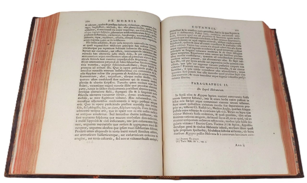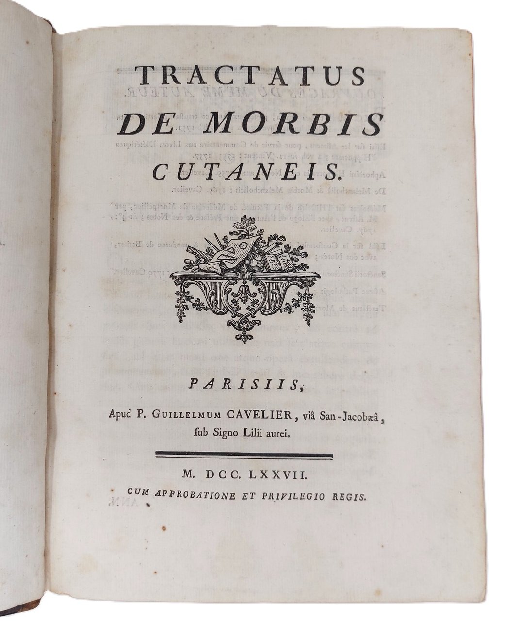 >in-4, pp. (4), XVI, 704, (4), bella legatura del tel tempo p. pelle marmorizz., dorso a nervi con tit. e ricchi fregi oro, tagli rossi. Il nome dell'autore si legge all'inizio della lunga prefazione all'amico Steph. Lud. Geoffroy. Prima edizione di trattato che costituisce il fondamento della dermatologia moderna francese; vi si esaminano a fondo i vari tipi di pelle, le cause delle infezioni, si descrivono i tumori e tutte le malattie dermatologiche, compresa la calvizie. Il Lorry (1726-1783) fu medico e scienziato che portò la sua indagine in vari settori della medicina. Bell'esemplare a larghi margini, con ex-libris della biblioteca del Dott. P.F. de la Bonnardière, uno dei più eminenti medici di Lyon del XIX secolo (brunitura della carta su pochi fogli) Waller 6020. D.S.B. VIII, 505-7. Garrison-Morton 3983: «Lorry is regarded as the founder of French Dermatology. A pupil of Jean Astruc, his most important work is his Tractatus, in wich he attempted the classification of diseases on the basis of essential relations, their physiological, pathological and etiological similarities. It is the first modern text on the subiect».