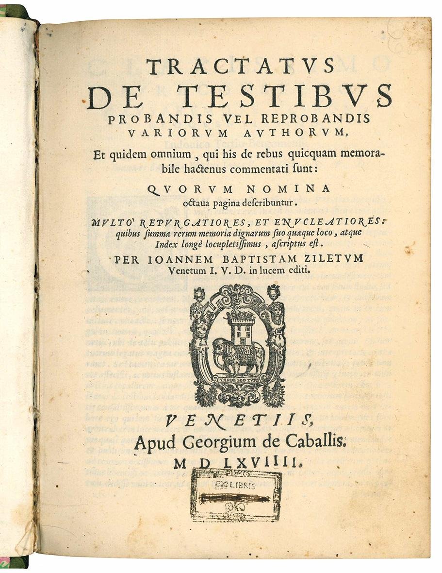 Tractatus de testibus probandis vel reprobandis variorum authorum, Et quidem omnium, qui his de rebus quicquam memorabile hactenus commentati sunt: ... Multò repurgatiores, et enucleatiores: quibus summae rerum memoria dignarum suo quaeque loco, atque Index longè locupletissimus, ascriptus est. Per Ioannem Baptistam Ziletum Venetum I.V.D. in lucem editi.