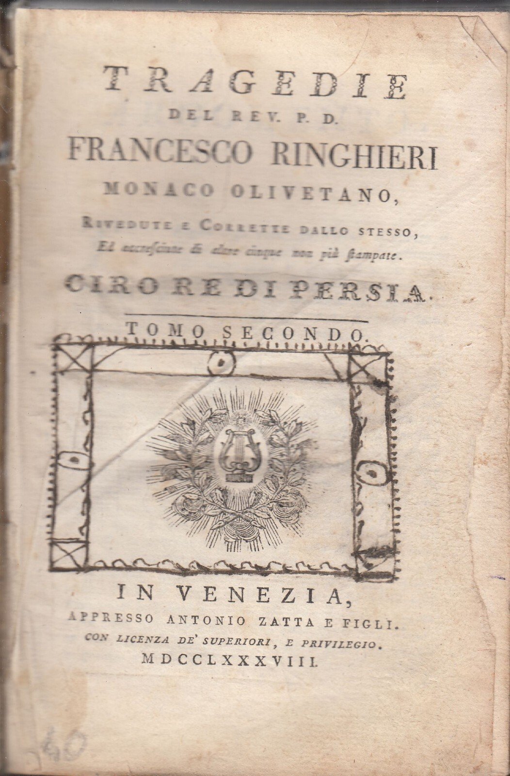 TRAGEDIE del reverendo Francesco Ringhieri Solo il tomo II che contiene: Ciro re di Persia, la Gerusalemme, l'Osiride.