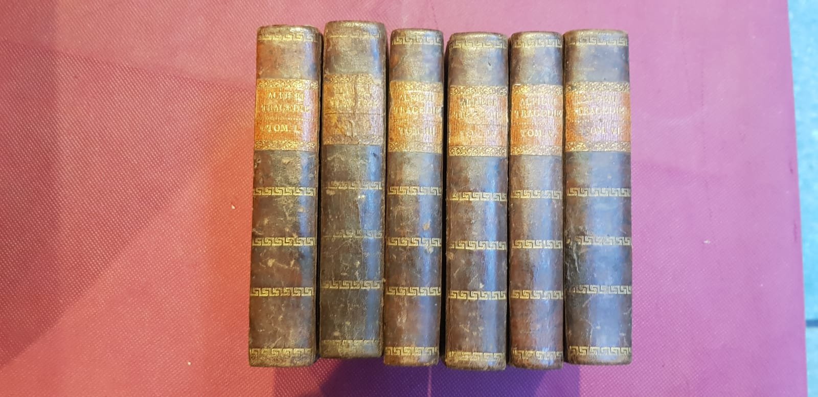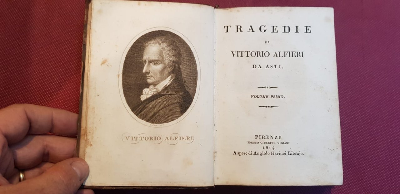 6 voll. in-16°, pp. 1400 circa complessive, antiporta incisa ad ogni volume, un ritratto dell'autore e 21 tavv. f. t. incise in rame dal Verico su dis. di G. Bazzoli. Legature coeve in mezza pelle con titolo e fregi in oro al dorso. Bella edizione. Bustico, p. 10: 'Questa edizione è la prima, in ordine di tempo, dove si trovino gli Argomenti per ciascuna tragedia, stesi dall'ab. Carlo Mengoni per incarico dell'editore.'