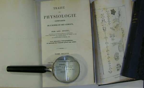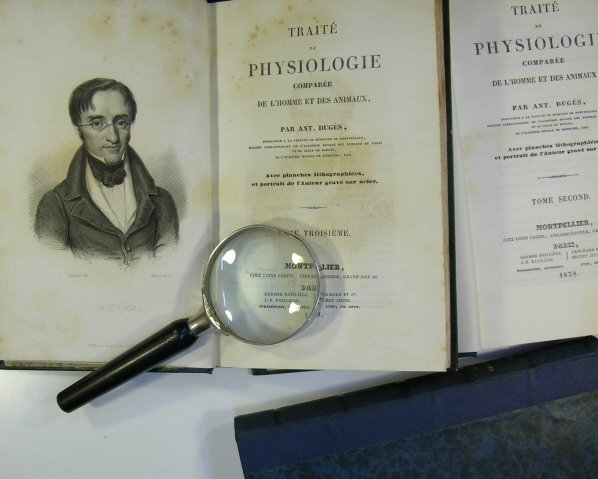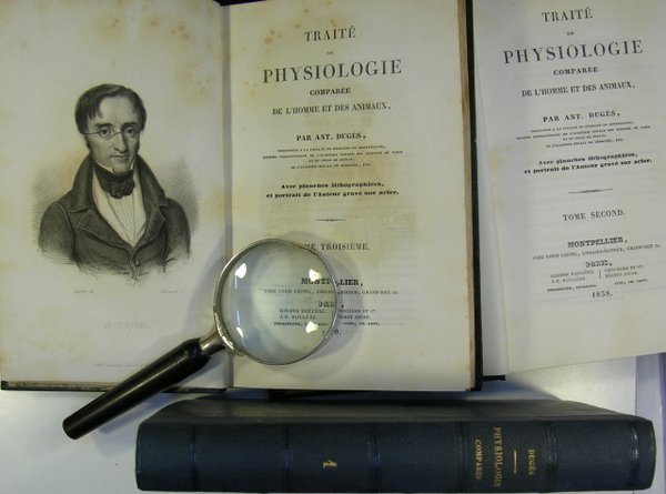 Louis Castel, Montpellier, 1838-39. 3 volumes reliure demi toile bleue, tome 1 : 526 p. et 6 planches , tome 2 : 636 p. et 12 planches tome 3 : 494 p. frontispices en tome 1 et 3 (un portrait de Dugès). Les trois dernières planches du tome 2 sont trouées, rare rousseurs.DUGÈS (Antoine-Louis), médecin et physiologiste français, membre de l'Académie des sciences, né à Mézières (Ardennes) en 1797, mort en 1838. Reçu docteur en 1821, il devint professeur d'accouchements à la Faculté de Montpellier. Il s'occupa d'abord avec succès des accouchements, puis de toutes les branches des sciences médicales, sur lesquelles il a laissé des travaux lumineux. Dans un Essai physiologico-pathologique sur la nature de la fièvre, il a tenté une fusion entre les doctrines de Broussais, de Cullen, de Brown, de Darwin et de l'école hippocratique ; son Mémoire sur la conformité organique dans l'échelle animale fut le signal d'un remaniement des classifications zoologiques; en 1834, des Recherches sur l'ostéologie et lamyologie des batraciens à leurs différents âges, lui valurent une couronne de l'Institut ; enfin un Traité de physiologie comparée de l'homme et des animaux , fut son testament scientifique. Ce livre abonde en aperçus ingénieux, en expériences entièrement neuves. On a encore de Dugès, outre de nombreux articles dans les ouvrages et les recueils scientifiques : Recherches sur les maladies les plus importantes et les moins connues des enfants nouveau-né; Pratique des accouchements, Manuel d'obstétrique ; De l'influence des sciences médicales accessoires sur les progrès de la chirurgie moderne.