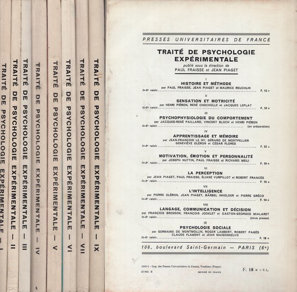 1 - Histoire et Métode, 2 - Sensation et Motricité, 3 - Psychophysiologie et Comportement, 4 - Apprentissage et Mémoire, 5 - Motivation, Emotion et Personnalité, 6 - La Perception, 7 - L'Intelligence, 9 - Psychologie sociale. Alcuni volumi intonsi, tutti con firma di appartenenza all'occhietto
