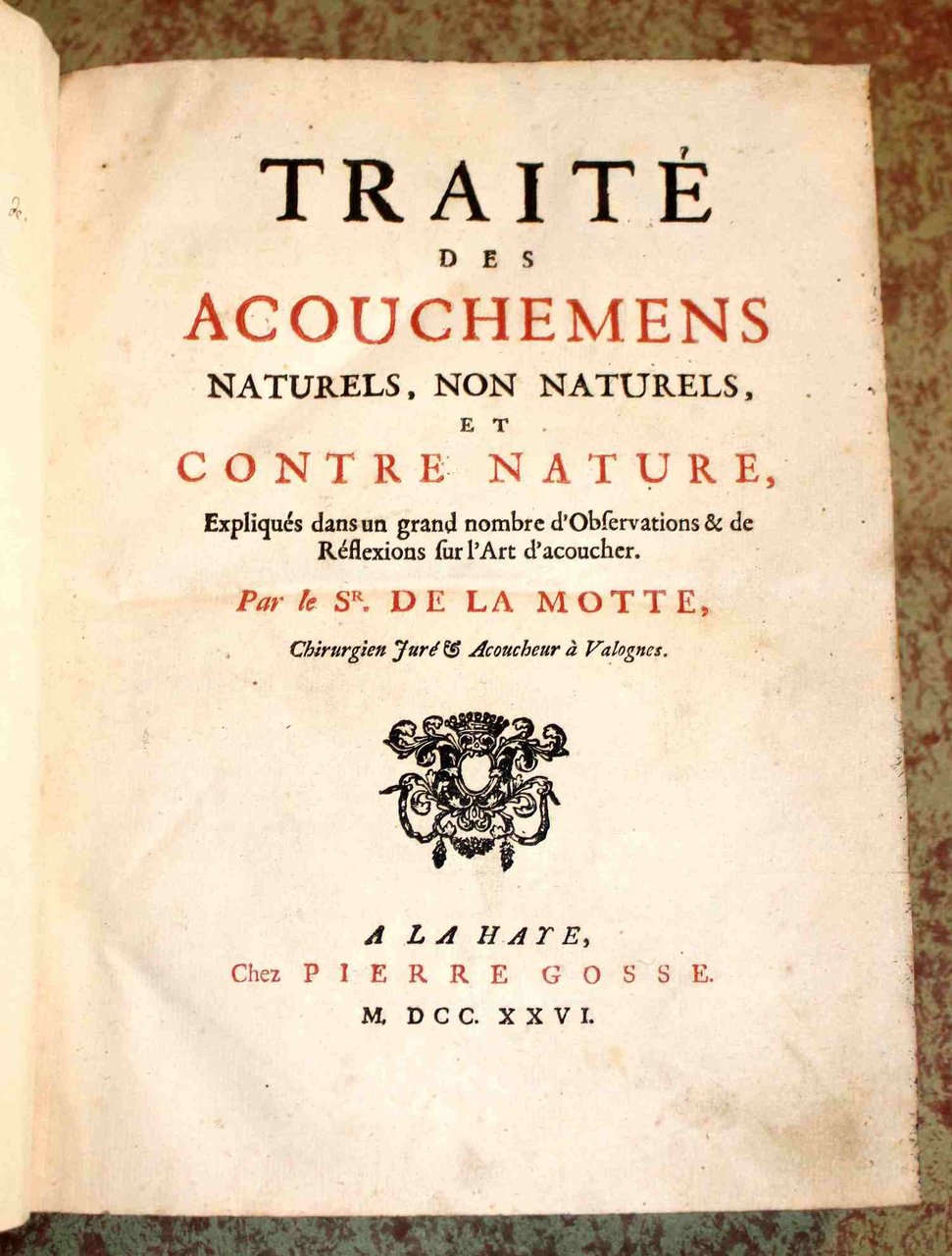 In 8° grande, pp. XXIV, 752, solida legatura tutta pelle coeva bazzana con qq. menda alle cuffie e agli angoli, titolo in oro su tassello al dorso con fregi con motivi floreali, tagli screziati, frontespizio in rosso e nero, testatine ornate. Buon esemplare, alcune macchioline sparse n.t., leggerissime arrossature per la qualità della carta e un lavoro di tarlo al margine superiore (non tocca il testo) dell'indice finale. Ricercata e monumentale opera (la cui edizione originale risale al 1721) del De La Motte (1655-1737) che tratta con osservazioni e riflessioni i casi occorsigli durante la sua carriera di medico su 458 casi di gestazione. 'This great mass of critical observations and reflections by a scholarly and conscientious country physician was a unique contribution and one of the landmarks of the history of midwifery' (Cutter & Viets 197). Bibl.: Garrison Morton,6150; Blake,293; Wellcome,439; Waller 5528 (later edition).