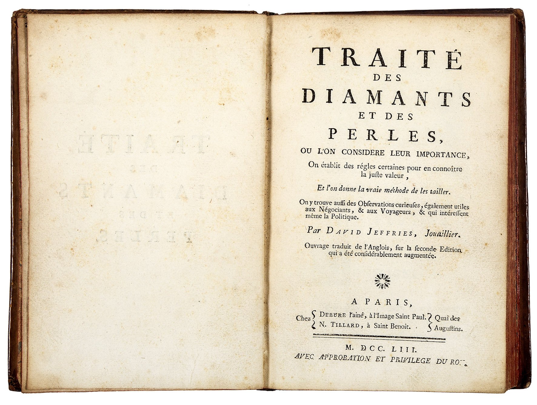 PRIMA EDIZIONE IN FRANCESE, dedicata al Principe di Condé, del fortunato Treatise on Diamonds and Pearls del gioielliere inglese David Jeffries nella traduzione realizzata da Chappotin S. Laurent della Bibliothèque Royale sulla seconda edizione inglese aumentata e corretta (London, 1751). Rispetto alla prima edizione dell'anno precedente, alla seconda edizione furono infatti aggiunte sezioni sui diamanti brasiliani, su metodi alternativi di valutazione e sul taglio indiano.