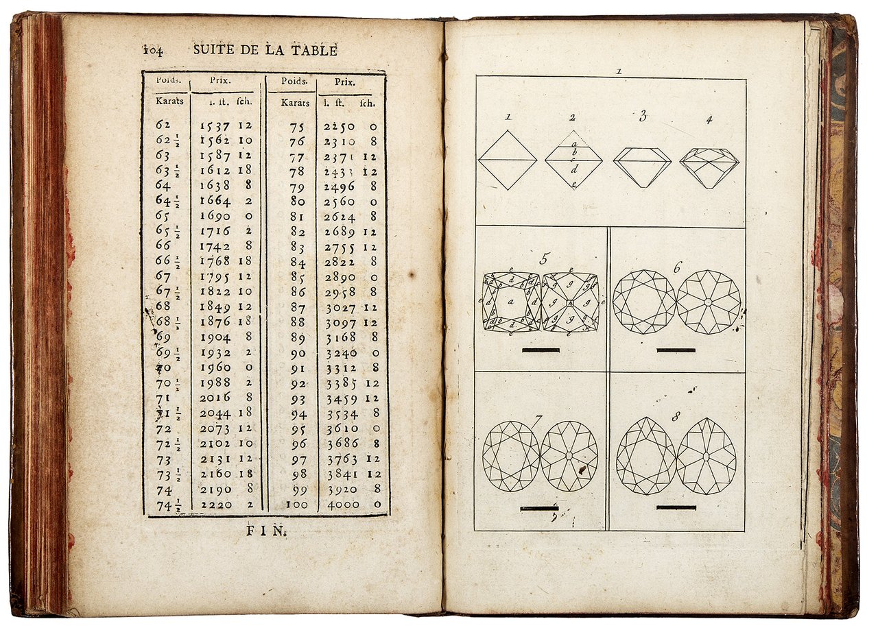 “An example of a book that is of both artifactual and intellectual value to jewelry historians is David Jeffries' A Treatise on Diamonds and Pearls written and published in 1750, which describes the commercial aspects of cut diamonds, establishing guidelines for evaluating, pricing, and defining diamond cutting styles. This book is thought to be one of the first books to discuss these topics, and it is listed as a source by many of the authors of the early books found in the core bibliography” (Ch. De Bow Klein, Jewelry History: A Core Bibliography in Support of Preservation, Washington, 1992).