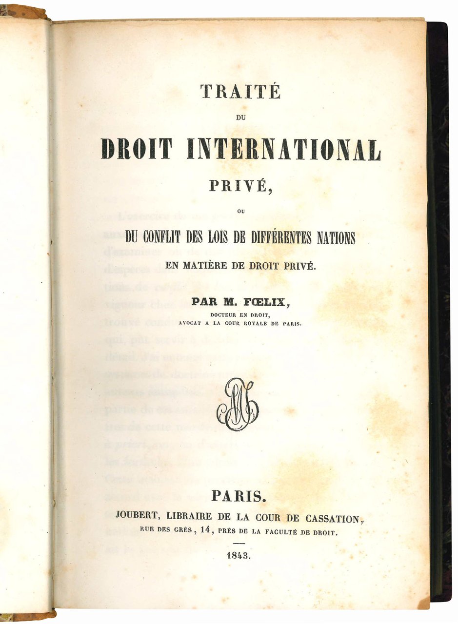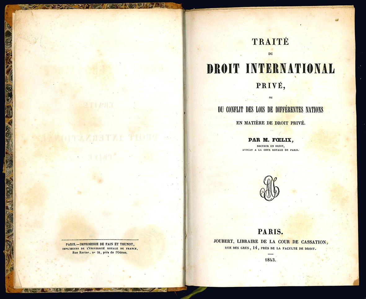 Traité du droit international privé, ou du conflit des lois de differentes nations en matière de droit privé. Par m. Foelix docteur en droit, avocat a la Cour Royale de Paris.