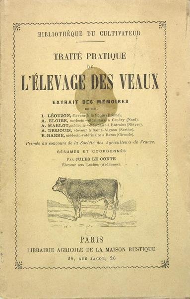 Librairie agricole de la maison rustique, Paris, 1895. In-12 (18 x 12 cm) broché, couverture illustrée d'une vignette, 9 illustrations in-texte, 180 p. Hormis une tache sur la couverture, très bon état. Mémoires d'éleveurs et médecins vétérinaires : gestation, vêlage, hygiène et maladies de la vache après le vêlage ; le veau : hygiène et pricipes généraux de l'élevage, premiers soins, allaitement naturel, allaitement mixte et artificiel, sevrage, choix des veaux d'élevage, engraissement, maladies, castration ; exemples pratiques d'élevage et d'engraissement des veaux (France & Angleterre), méthode Betz-Penot.
