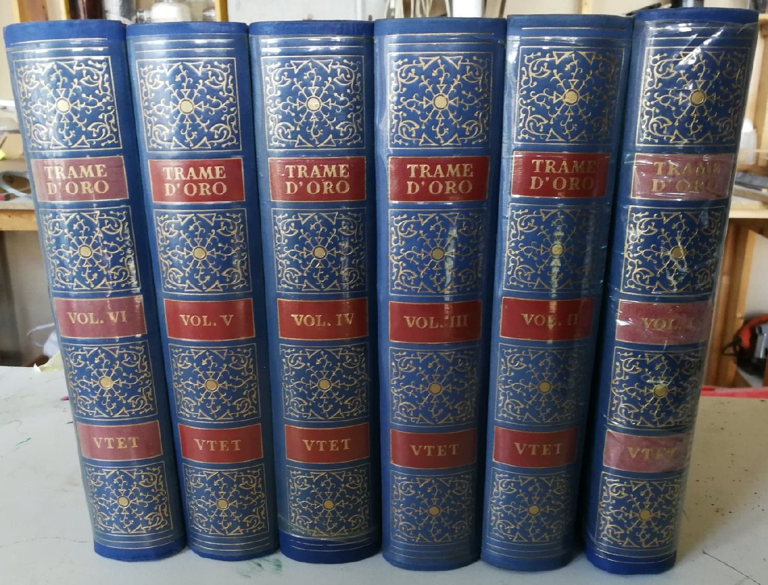 Torino, Utet 1958Cartonati in tela azzurra con fregi in oro e titoli su tassello rosso al dorso, taglio superiore in rosso, sovracoperta trasparente in acetato, 6 volumi, 18,5x27 cm ca., pp. 5080 totali: XVI+776; XII+784; XII+858; XII+848; XII+852. X+888. 2268 illustrazioni i nero nt, più 96 tavole su carta pesante delle quali 48 a colori