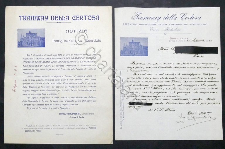 Tramway della Certosa di Pavia Inaugurazione e Esercizio: notizia e lettera 1913