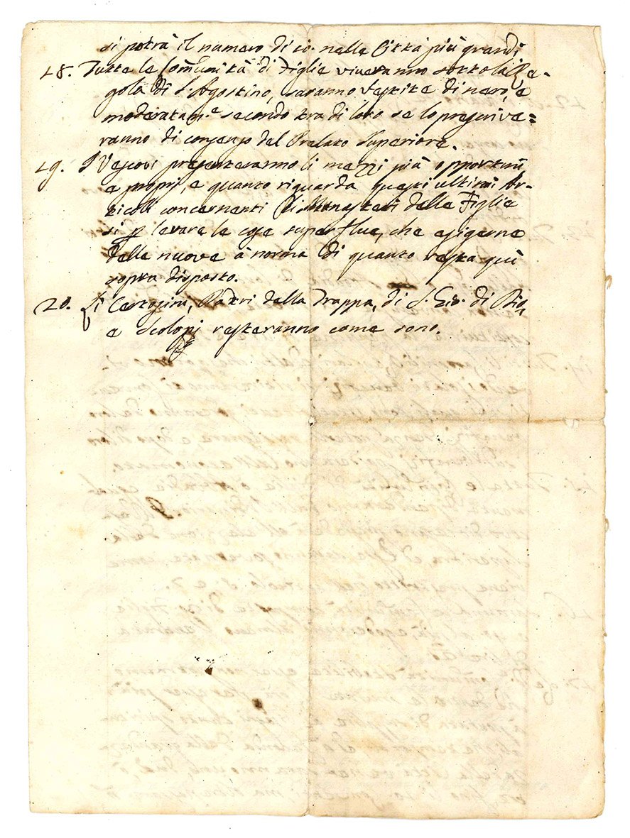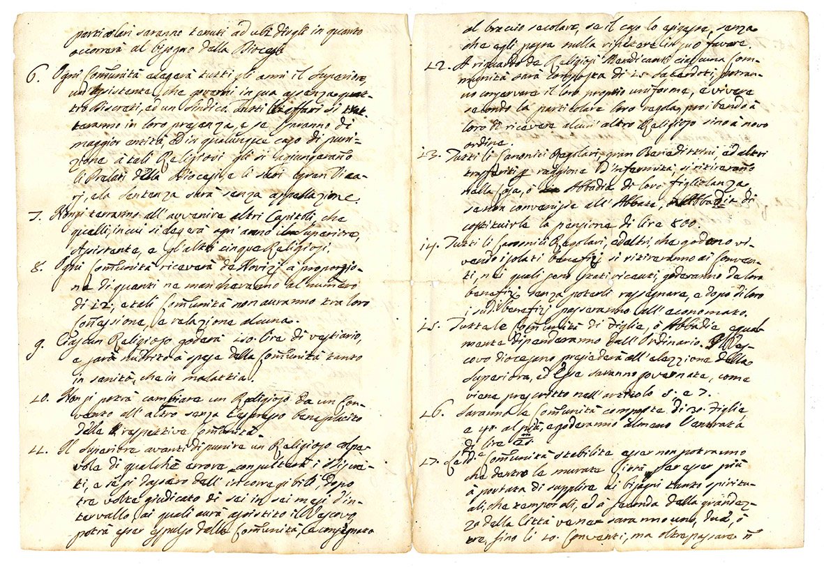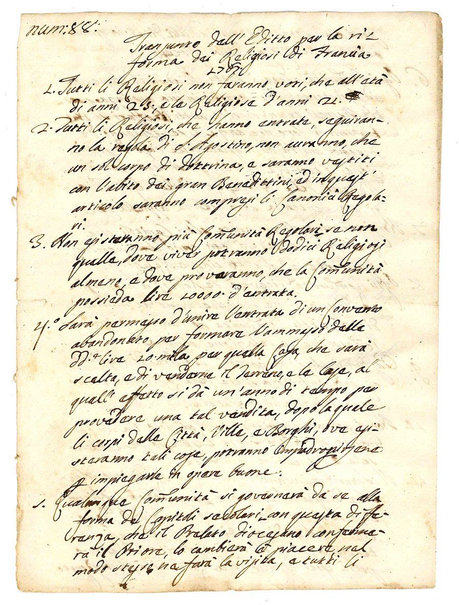 Interessante documento nel quale la riforma degli ordini religiosi in Francia viene presentata in venti punti. L'ultimo punto afferma: "Li Certosini, Padri della Trappa, di S. Gio. di Dio e Scolopi resteranno come sono".