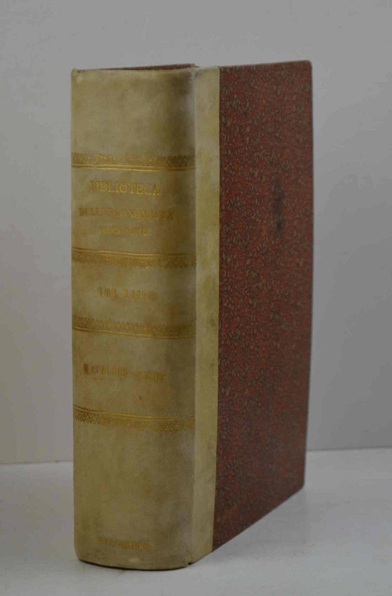 Cm. 23,5, pp. lxxxvii (1) 1191 (1). Solida ed elegante legatura di fine '800 in mezza pergamena con piccole punte, dorso liscio con titoli in oro e piatti in carta marmorizzata. Esemplare genuino ed in ottimo stato di conservazione. Volume appartenente alla collana: Biblioteca dell'Economista. Prima serie vol. XIII. Contiene: CULLOCH. Princpii d'economia politica. CAREY. Principii d'economia politica.