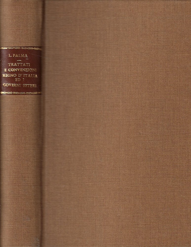 Testi raccolti ed ordinati da Luigi Palma e preceduti da un suo discorso sul diritto pubblico. Legatura tutta tela marrone, con titoli in oro solo al dorso all'interno di tassello marrone, non coeva ed in ottimo stato. Pagine ingiallite, con tagli irregolari, salde, con ampio margine ed ancora intonse, con testi in italiano e francese e con gore sparse. Numero pagine 672.