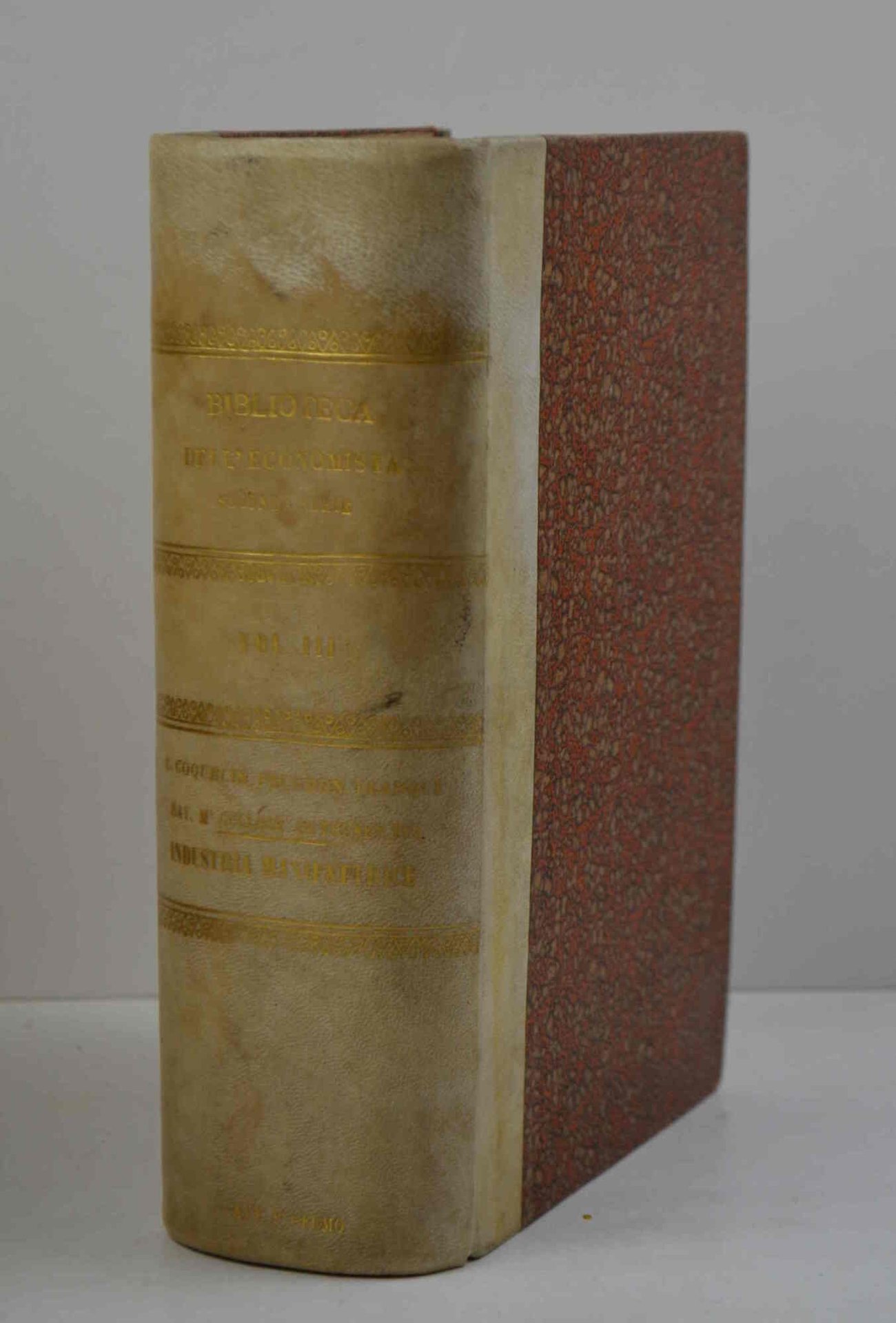 Cm. 23,5, pp. cli (1) 1351 (1). Solida ed elegante legatura di fine '800 in mezza pergamena con piccole punte, dorso liscio con titoli in oro e piatti in carta marmorizzata. Esemplare genuino ed in ottimo stato di conservazione. Volume appartenente alla collana: Biblioteca dell'Economista. Seconda serie vol. III. Contiene 7 trattati di C. Coquelin, A. Ure; Babbage, Proudhon, Fontenay, Blanqui, Clement, Dareste, Levasseur, Say, Culloch, De Thunen, Cherbuliez, Fix, Villermé, Audiganne.