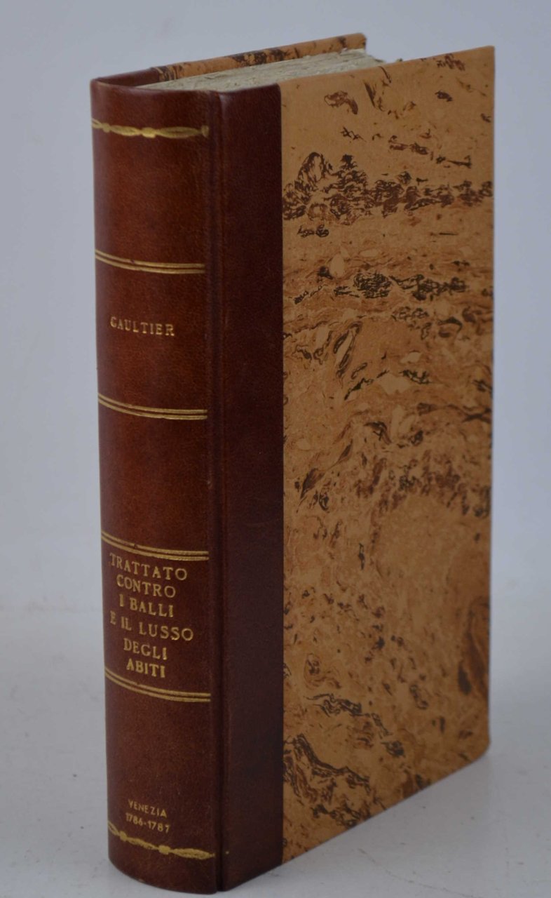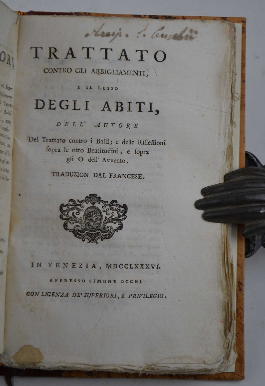 Pp. 344. Unito a: Trattato contro gli abbigliamenti, ed il lusso degli abiti dell'autore del Trattato contro i balli… In Venezia, Occhi, 1786. Pp. 140. Due opere in un volume di cm. 20. Legatura recente in mezza pelle, dorso liscio con titoli e filetti in oro. Esemplare marginoso e genuino con solo un tarletto al margine bianco di poche carte. Interessante e non comune insieme di due opere curiose.