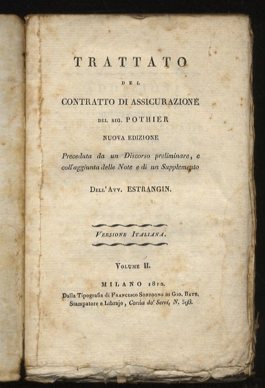 Trattato del contratto di assicurazione del Sig. Pothier. Nuova edizione, preceduta da un discorso preliminare, e coll'aggiunta delle note e di un supplemento dell'Avv. Estrangin. Versione italiana. Volume II.