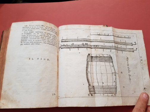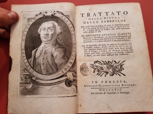 In-8°, pp. XXXII, 279, (2) di errata, frontespizio allegorico in antiporta, ritratto dell'autore e 38 tavv. f.t. incise in rame, legatura coeva in piena pelle, dorso a cinque nervi, titolo su tassello e fregi in oro al dorso. Cuffie mancanti, cerniera superiore fessurata ma il piatto risulta saldamente legato. Tagli rossi. Timbro di biblioteca privata al frontespizio. Prima edizione di questo importante trattato di stereometria applicata all'architettura, volto ad esporre i metodi per misurare e stimare le quantità e di costi dei materiali per i più diversi spazi e strutture, tra cui i più complessi esempi di volte e di cupole degli edifici del tempo. L'opera contiene un'appendice 'del modo di misurare le capacità delle Vasche, Legnaj, Fenili [sic], Grani, ec. Ed in fine alcune Memorie levate dalla Storia della Reale Accademia di Parigi, e tradotte dal Francese attinenti alla misura delle Volte, ad estinguere gl'incendj, misurare le Botti, ed altri simili aderenti alle Fabbriche'. Riccardi, I, 1, 16-17: 'Può collocarsi fra i migliori trattati di stereometria e voltimetria fino a quei giorni pubblicati'. Cicognara, 389.