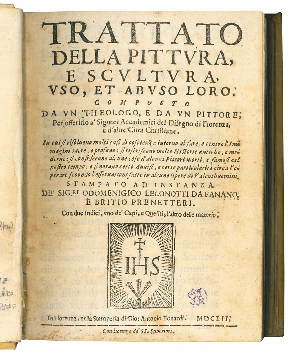 Trattato della pittura, e scultura, uso, et abuso loro. Composto da un theologo, e da un pittore, per offerirlo a' signori accademici del disegno di Fiorenza, e d'altre città christiane. In cui si risolvono molti casi di coscienza intorno al fare, e tenere l'immagini sacre, e profane [...] Stampato ad instanza de' Sig.ri Odomenigico Lelonotti da Fanano, e Britio Prenetteri. Con due indici, uno de' capi, e quesiti, l'altro delle materie