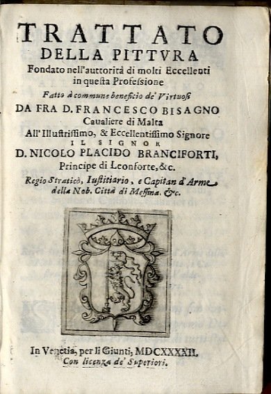 >in-8 picc., pp. (16), 233, (3, le ultime 2 bb.), legatura coeva p. perg., tit. calligr. manoscritto al dorso. Sul titolo stemma inciso del conte Nic. Placido Branciforti cui l'opera è dedicata; testatine, finalini, iniz. ed ornamenti silogr. Prima ed unica edizione di questo raro ed interessante trattato sulla pittura manierista, scaturito dalle conversazioni con vari artisti delll'epoca intrattenute dal Bisagno, frate e cavaliere di Malta, del quale evidenzia la concezione estetica indipendente ed originale. Esso è ''ricco di notizie pratiche e tecniche e di ricette, non senza qualche nota occultistica nella teoria dei colori'' (Cat. Vinciana n. 4341), argomento, quest'ultimo, cui sono dedicati i capitoli XVI e XXXIV. Si trovano, inoltre, qua e là utili indicazioni sulle diverse tecniche pittoriche, sulla luce e sull'ombra, sui gesti e le espressioni del volto, sui paesaggi, sull'antica staturaria, su come raffigurare la guerra, le battaglie navali, le architetture e le allegorie, sul modo di decorare librerie, volte, cappelle, palazzi, ecc. Ottimo esemplare, estremamente raro poichè censito in sole 10 biblioteche pubbliche italiane. Cicognara 84. Cat. Vinciana n. 4341. Schlosser-Magnino pp. 615 e 623. Camerini II, n. 1351. BMC, XVII sec. 151. Michel-Michel I, 169.