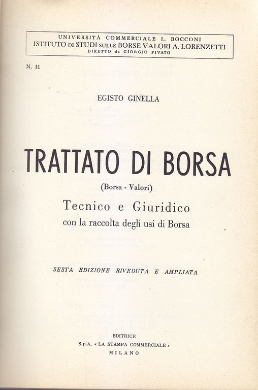 TRATTATO DI BORSA TECNICO E GIURIDICO di Egisto Ginella 1960 libro Valori