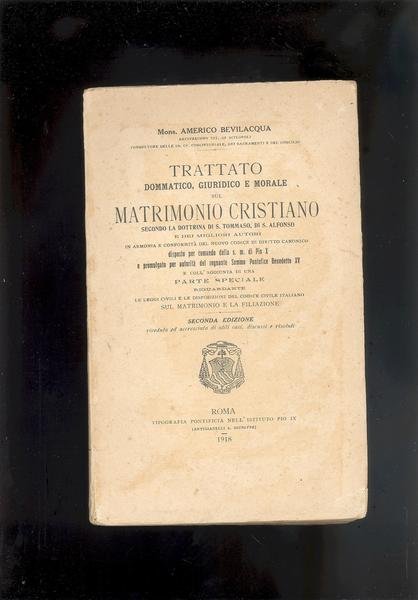 IN 8°,pp.XXIII+302. E' IL NUOVO TRATTATO SUL MATRIMONIO CRISTIANO SECONDO IL COMANDO<BR>DELLA S.M. DI PIO X E PROMULGATO PER AUTORITA' DEL REGNANTE SOMMO PONTEFICE<BR>BENEDETTO XV. 2° EDIZIONE RIV. E ACCR. OTTIMA CONSERVAZIONE ID 495