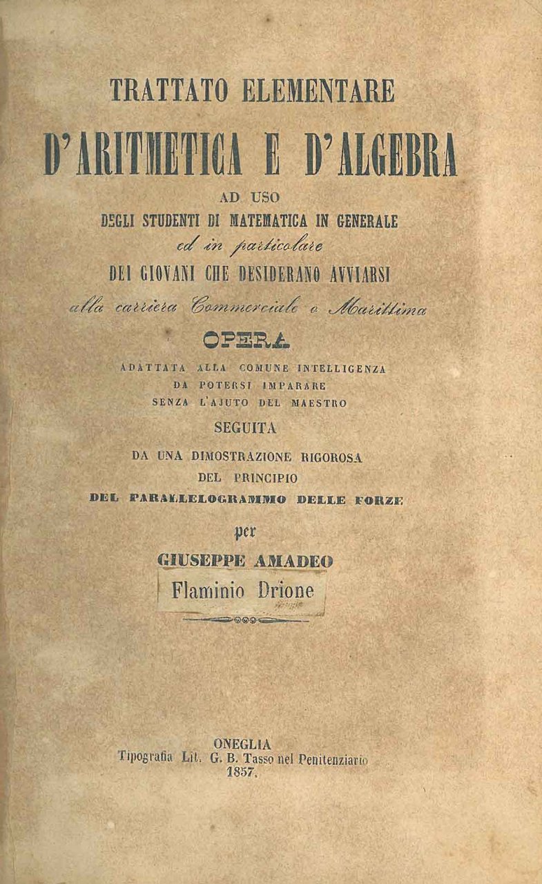 Trattato elementare d'aritmetica e d'algebra ad uso degli studenti di matematica in generale ed in particolare dei giovani che desiderano avviarsi alla carriera commerciale e marittima. Opera adattata alla comune intelligenza da potersi imparare senza l'a