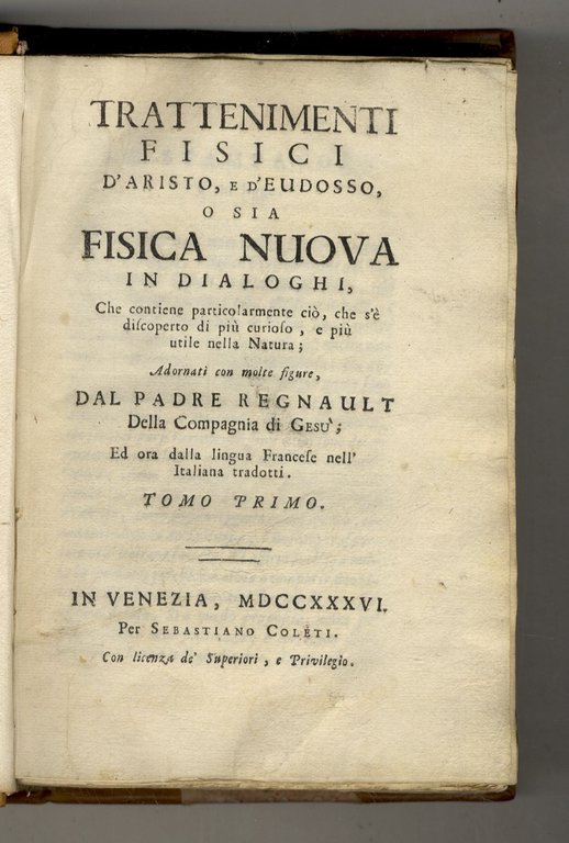 Trattenimenti fisici d'Aristo, e d'Eudosso, o sia Fisica nuova in dialoghi, che contiene particolarmente ciò, che s'e discoperto di piu curioso, e piu utile nella natura; adornati con molte figure, dal padre Regnault [.] Ed ora dalla lingua francese nell'italiana tradotti. Tomo primo [- tomo terzo].