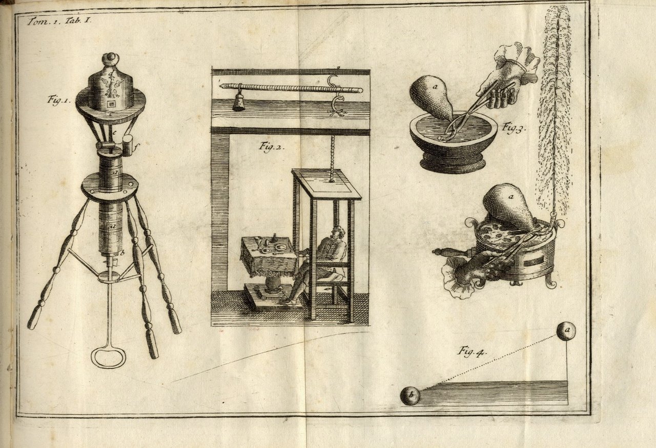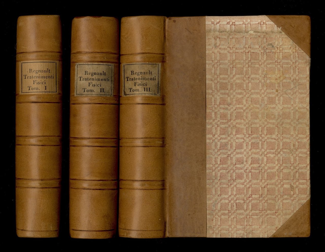 In Venezia, per Sebastiano Coleti, 1736, voll. 3, in-8, legatura moderna in mezza pelle con punte, dorsi a 4 nervi con titolo a stampa su tasselli di carta applicati in uno scomparto, pp. XVI, 383, [1] - 428 - 400. Con complessivamente 25 tavole incise in rame ripiegate in fine ai volumi (9 + 9 + 7). Prima edizione italiana di questo interessante trattato che affronta numerosi argomenti diversi, tra cui: la natura dei corpi e del moto, minerali, calamite, gravità, idrostatica, polvere da cannone, chimica, terremoti, maree, anatomia, specchi, colori “spiegati secondo il sistema del Sig. Newton”, funghi, piante, animali, corpi celesti, ecc. Ottime condizioni di conservazione, ad ampli margini, in parte intonsi.