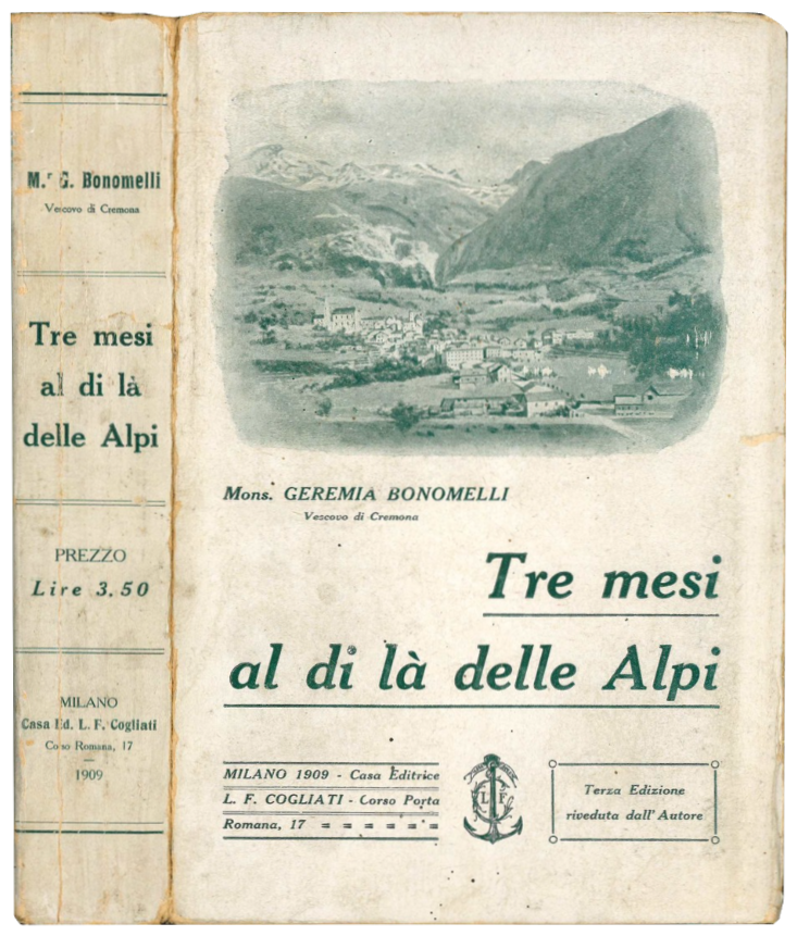 Mm. 191x127. Pp. 434. In anteporta fotografia del Mons. Geremia Bonomelli. Cc. lievemente ed uniformemente brunita, esemplare in barbe e a fogli chiusi. Brossura editoriale con titolo al dorso e alla copertina anteriore. Lievi mancanze alle cerniere e al dorso. Terza ed. riveduta dall'autore.