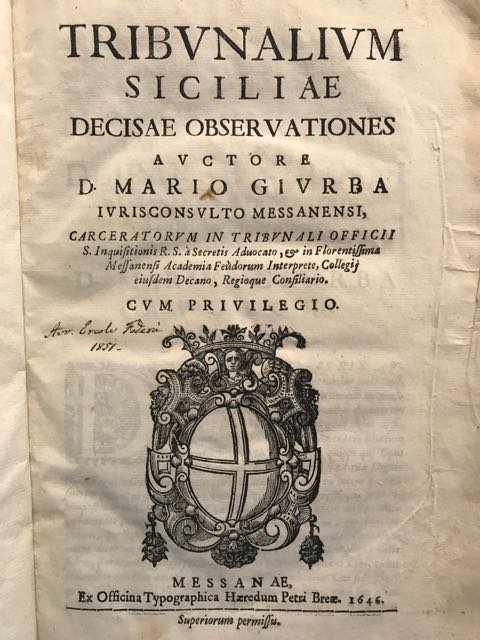 <font face="Arial, Verdana" size="2">In-folio (cm. 29,8), legatura successiva in m. pelle con titolo in oro su tassello e sobrie dorature al dorso (lievi usure); pp. [24] 805 [49] con testo su doppia colonna, stemma in silografia di Messina al frontespizio e in fine al testo, nonché del Regno in fine all'indice; una firma di proprietà al frontespizio (1851); ultimo fascicolo con angolo inferiore gorato e sbocconcellato e lieve fastidio al testo, alcune bruniture e sporadiche fioriture. Edizione originale delle Observationes, ultima opera del grande giurista e politico messinese pubblicata tre anni prima della sua morte, già pronta da qualche tempo ma edita solo dopo la detenzione per sedizione che scontò a 77 anni. Giurba raccoglie le sentenze più significative dei tribunali del Regno; prende in esame più di cinquant'anni di giudicati per offrire un quadro esauriente dello stylus delle curie sicule e criticarne le incongruenze. Cfr. Mira I, 442; Mongitore II, 48; Narbone II, 176; Lipari 187. Esemplare più che discreto. (NP2)</font>