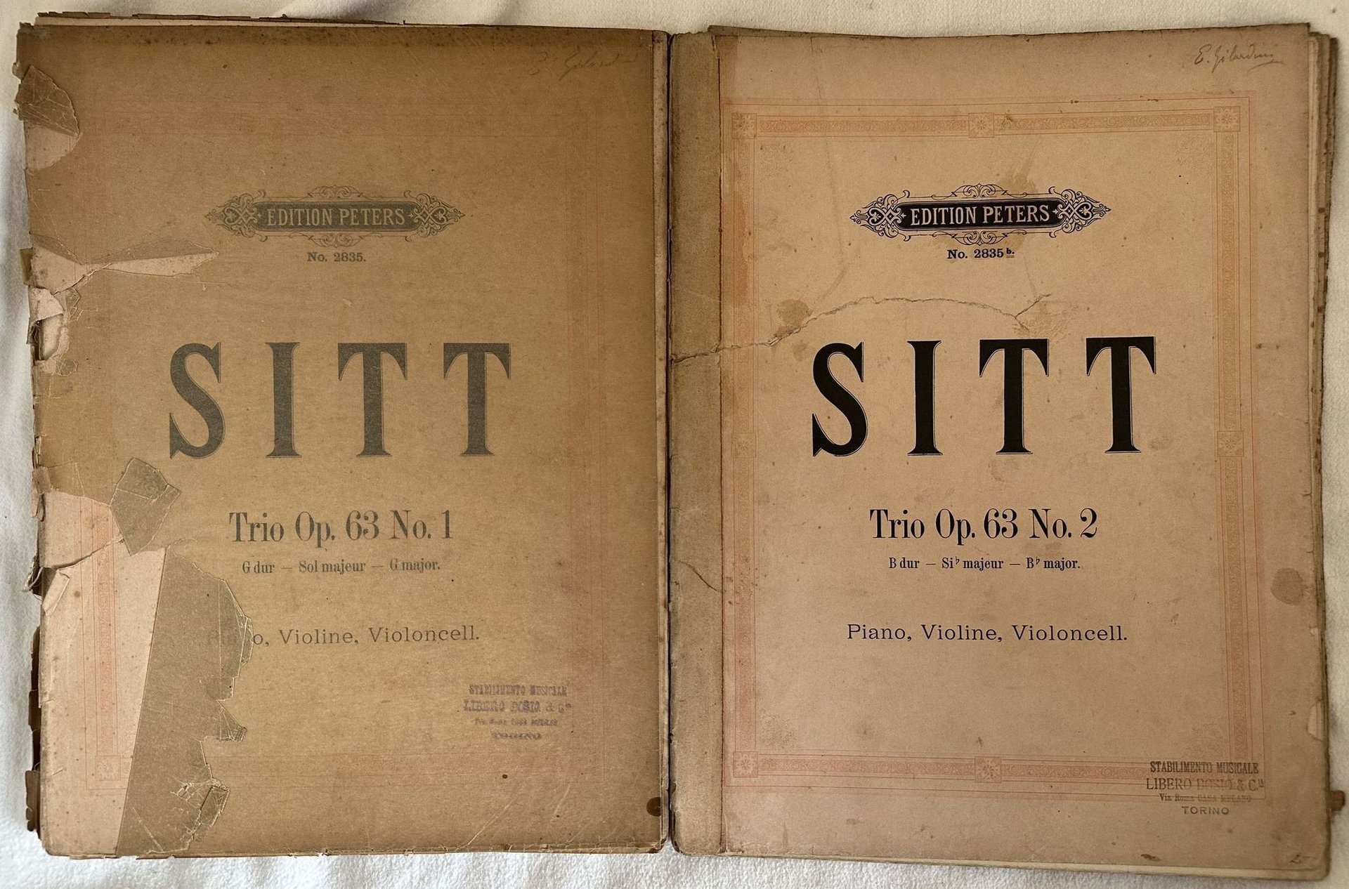 Edizione di fine ottocento o inizi novecento della melodia "Trio fur piano violine und violoncell" dall'opera 63 numero 1 e 2 di Hans Sitt (1850-1922) compositore violinista e violista ceco. All'interno partitura per violino violoncello e pianoforte. In discrete condizioni. Copertina editoriale in discrete condizioni generali con lievi usure ai margini e dorso. Strappo. Legatura in discrete condizioni. Pagine in buone condizioni con fioriture. In folio. cm. 31x23,5. Pp. 7, 7, 26, 27, 9, 9.Edition of late 19th century of early 20th century of the melody "Trio fur piano violine und violoncell" from the opera 63 number 1 and 2 by Hans Sitt (1850-1922) compositore violinista e violista ceco. There are the complete scores of piano, violin and violoncello. In fair conditions. Editorial cover in fair conditions lightly worn in the extremities. Tear. Binding in fair conditions. Pages in good conditions with foxing. In folio. cm. 31x23,5. Pp. 7, 7, 26, 27, 9, 9.