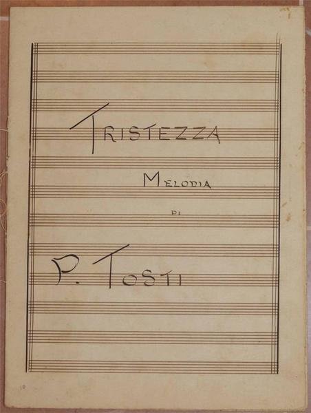 Formato cm. 29,5x22. Pp. (7). Bello spartito manoscritto degli anni '30 della melodia "Tristezza" di Francesco Paolo Tosti (1846-1916) compositore italiano conosciuto per essere l'autore di celebri romanze da salotto e da camera. La partitura è composta dalla partitura per pianoforte e per canto. Il titolo è manoscritto alla prima pagina. In buone condizioni con fioriture e mende. Beautiful manuscripted musical score of the song "Tristezza" by by Francesco Paolo Tosti (1846-1916) italian composer known to be the author of famous romances. The musical score is made up of the music for piano and text. The title is manuscripted in the first page. In good conditions with foxings and usage signs.<BR>