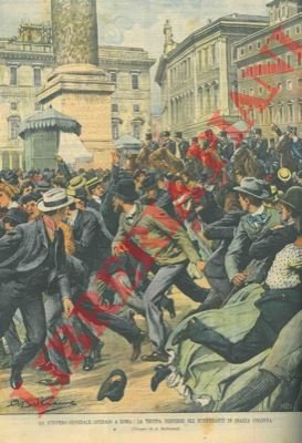 Truppa a cavallo disperde gli operai radunati in sciopero in piazza Colonna, a Roma.