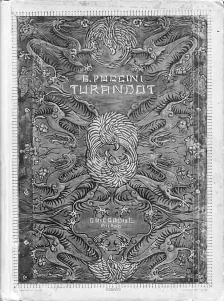 Spartito. Riduzione per canto e pianoforte di G. Zuccoli. P.N. 119772 (1926). Timbro a secco editoriale “Ricordi “3 -26” e etichetta dentellata illustrata firmata da Cisari (3,6 x 6 cm) “Ricordi omaggio degli editori”. Dorso allentato. Ritratto dell’autore in platinotipia (Bertieri) con firma in facsimile. Elenco dei personaggi completo del nome degli interpreti tra cui Rosa raisa e Michele Fleta. Direttore Arturo Toscanini. Rara prima edizione.