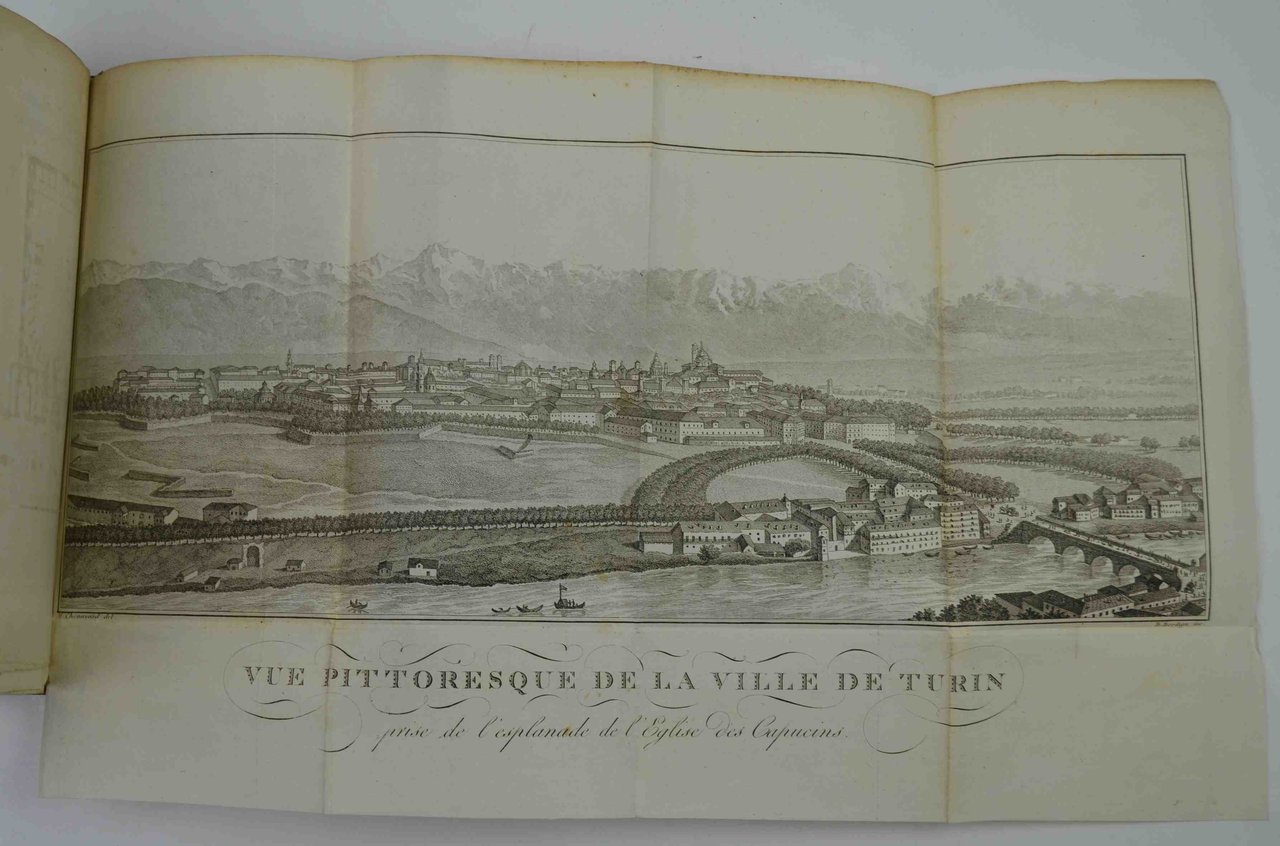 Cm. 20,5, pp. xxii (2) 440. Con complessive 16 tavole fuori testo incise in rame, di cui 13 più volte ripiegate. Legatura coeva in mezza pelle, dorso a nervi con titoli e fregi in oro. Esemplare genuino e ben conservato, particolarmente marginoso. Si tratta di un esemplare stampato su carta di buona qualità (sia nella parte testuale che in quella iconografica), migliore di altri da noi visionati. Edizione originale ed unica della prima guida "moderna" di Torino, concepita ad uso degli stranieri in viaggio in Italia. Non comune. Cfr. Fossati Bellani, II, n. 1780