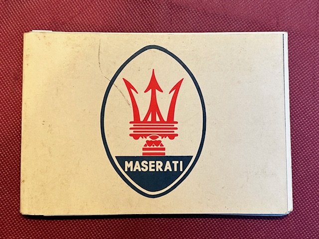 In -16°oblungo (17 x12 cm) pp. 35 nn. , numerose illustrazioni fotografiche delle autovetture, brossura editoriale con marchio della Maserati al piatto superiore. Una piega alla prima pagina.