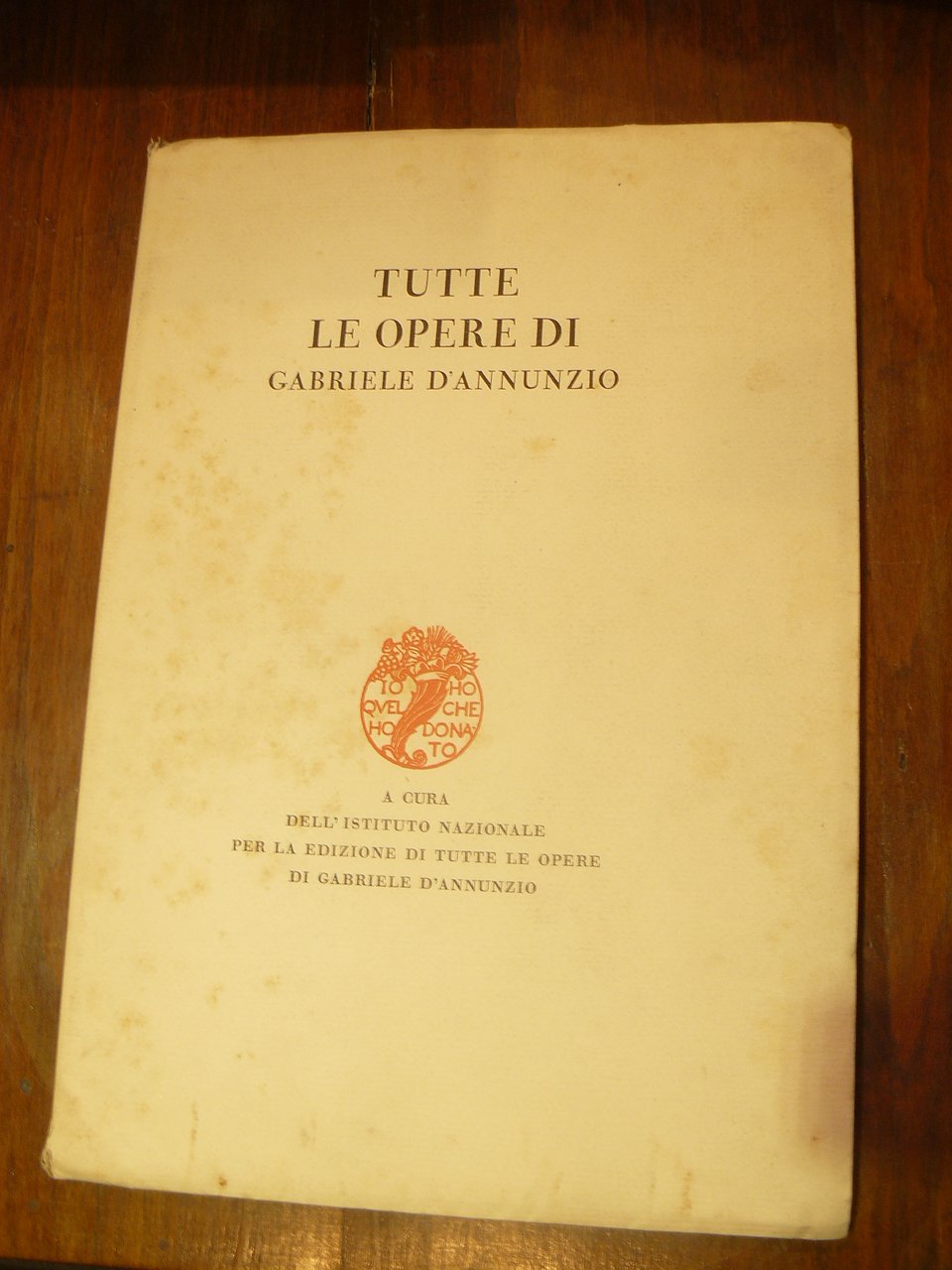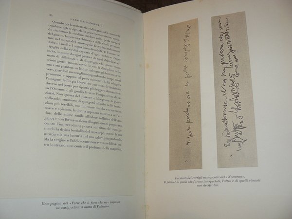 In-4°, pp. 36 più numerose tavole f.t. di manoscritti dannunziani posseduti e messi a disposizione dal Senatore Borletti , riproduzioni di fotografie in b/n. fac simili di testi e rilegature dei testi originali applicati, brossura con sovraccop. Il volume è stato curato da Angelo Sodini e impresso da Hans Mardersteig e Remo Mondadori con la direzione di Analdo Mondadori. Tiratura limitata a 2500 esemplari. Qualche brunitura alla sovraccoperta per il resto bell'esemplare