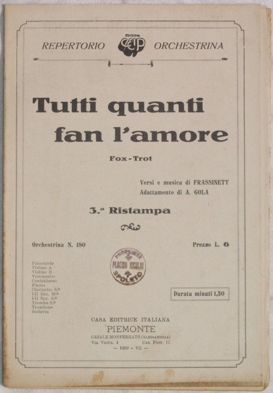 In 8. cm 26,5x18. Pp. 15. Partitura completa per orchestra del 1929 di una canzone russa. Caratteristica copertina decorata dell'epoca. Ex libris sulla copertina. Buone condizioni ; brunitura al margine inferiore. a complete score for orchestra of 1929. Carachteristic decorated cover of that period. Ex libris in the cover. Good conditions, browning in the lower edge.