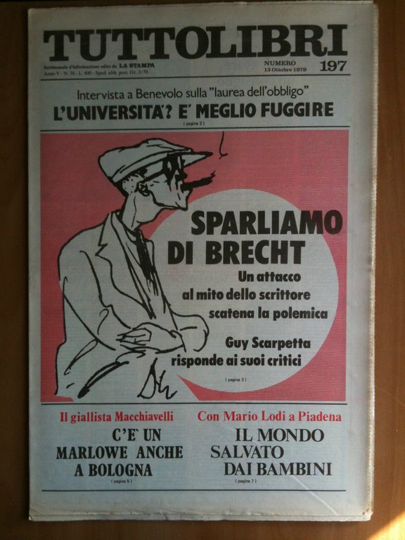 TUTTOLIBRIAnno V n^ 197 - 13 Ottobre 1979Intervista a Benevolo sulla "laurea dell'obbligo" - Sparliamo di Brecht - Alla fiera del libro il primo è Menuhin - L'autore di Fifina e Titina si chiamava Giuseppe Ungaretti - D'Annunzio amante caprino e la creatura di neve - Metastasio abate stimatissimo24 pagine formato 30x43 cm (75 g)E2637