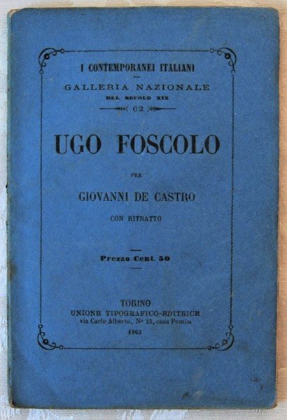 Unione Tipografica Editrice, 1863. In-16, brossura, pp. 86, una tavola con ritratto del Foscolo all'antiporta. Collana: Contemporanei italiani numero 62. Lievi fioriture, peraltro in buono stato.