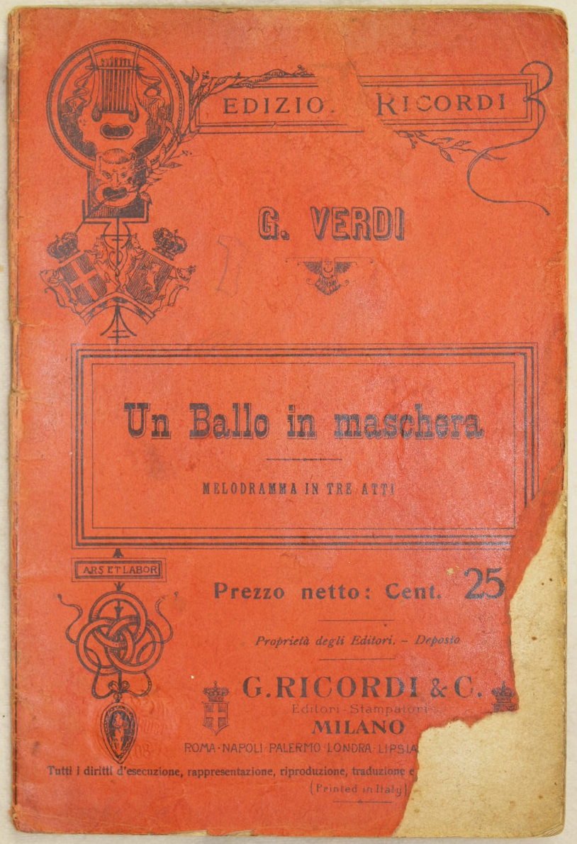 In 8. Dim. 19,5x13 cm. Pp. 36. Edizione del 1908 del libretto d'opera Un ballo in maschera di Giuseppe Verdi (1813-1901). Timbro a secco datato maggio 1908. L'opera venne rappresentata per la prima volta il 17 febbraio 1859 al Teatro Apollo di Roma. Note manoscritte. In buone condizioni. Copertina editoriale in buone condizioni generali con lievi usure ai margini e dorso. Parte mancante al piatto anteriore. Legatura in buone condizioni. All'interno le pagine si presentano in discrete condizioni con rare fioriture e lievi gore d'umidità. Edition of 1908 of this booklet Un ballo in maschera by the italian composer Giuseppe Verdi (1813-1901). Embossed stamp dated may 1908. The work was represented for the first time the 17th of february 1859 in Teatro Apollo of Rome. Handwritten notes. In good conditions Editorial cover in good general conditions slightly worn in the edges and spine. Missing part in the front plate. Binding in good conditions. Inside pages are in good conditions with occasional foxings. Slight water stains.