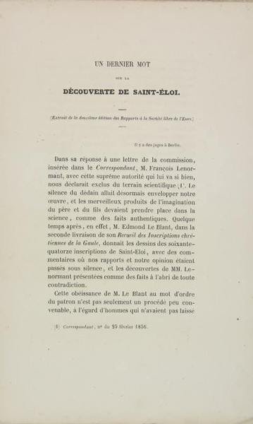 Evreux, A. Hérissey, s.d. (1856). Plaquette in-8 (22 x 14 cm) brochée, couverture muette, 15 pages. Excellent état. François Lenormant (1937-1883) Archéologue, voyageur-érudit, sous-bibliothécaire de l'Académie des inscriptions et belles-lettres, professeur d'archéologie à la Bibliothèque nationale de France, éditeur. Polyglotte et d'une grande curiosité intellectuelle, il aborde, tout comme l'avait fait son père avant lui, les problématiques touchant au Proche et au Moyen-Orient, à l'Égypte, à l'archéologie classique, à la numismatique, à la céramologie, à l'archéologie chrétienne et à l'étude des religions de l'Antiquité. Cependant, malgré un départ prometteur avec la publication, à l'âge de quatorze ans, d'une « Lettre à M. Haze sur des tablettes grecques trouvées à Memphis » (François Lenormant, Mémoire de l'Académie des inscriptions et des belles-lettres, Paris, 1851), on ne peut écrire objectivement sur François Lenormant sans mentionner la problématique de la fraude archéologique. Le premier incident est justement l'objet de la présente plaquette : les inscriptions, étudiées par des philologues français, anglais et allemands, se révèlent être des falsifications archéologiques. D'autres écrits de François Lenormant attirent l'attention des spécialistes européens sur une nouvelle fraude archéologique dans les années 1880, puis accusé de plagiat par Wihelm Fröhner (conservateur au musée du Louvre). Pourtant cet "érudit déconcertant » a su apporter à l'archéologie de son époque des éléments qui ont permis à cette dernière de s'ouvrir sur le XX siècle. (in INHA)