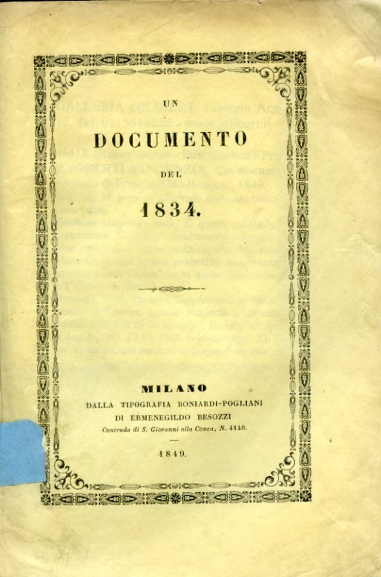 In-8°, pp. 39, brossura editoriale gialla con titolo entro cornice ornamentale incisa. Perfetta copia entro velina. Edizione originale, rara, di questo pamphlet (gli scritti del Gioberti sono firmati con lo pseudonimo 'Demofilo') confermante i contatti del Gioberti con la Giovine Italia nel 1834. Vi sono contenute 2 lettere indirizzate al fondatore della Civiltà Cattolica, il noto gesuita Carlo Maria Curci, che spesso polemizzò aspramente col filosofo torinese, sia sul tema del potere temporale della Chiesa che su quello della stessa Compagnia di Gesù, implacabilmente criticata nel 'Gesuita moderno'. Bertarelli, 3395. Passano, Supplemento al Melzi, p.93: 'Sotto questo psudonimo [Demofilo] si nascose il Gioberti quando cominciò a scrivere nel fasc. VI del giornale La Giovine Italia, fondato nel 1832 da G. Mazzini'. Barelli, Gli opuscoli in prosa della Biblioteca Salita dei Frati di Lugano, 381. CLIO, 1642. Sommervogel, XI, 1107. Cfr. (citato dal Passano), J. Artaud, Notice sur les italiens qui ont écrit en langue française, passim.