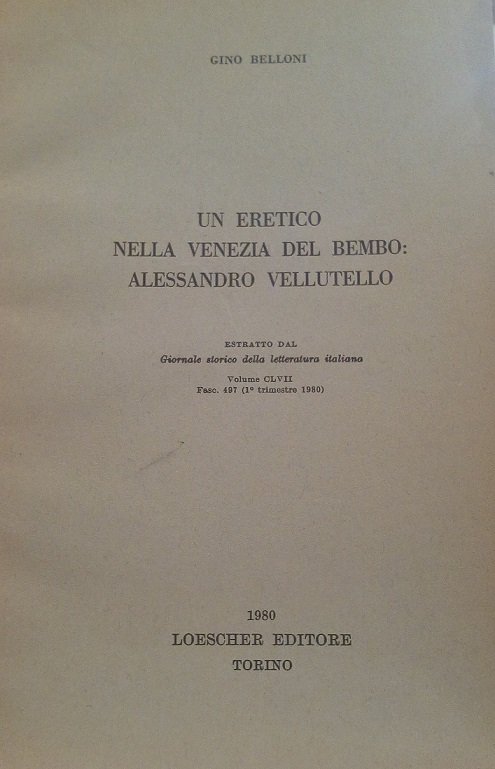 UN ERETICO NELLA VENEZIA DEL BEMBO: ALESSANDRO VELLUTELLO - ESTRATTO DA "GIORNALE STORICO DELLA LETTERATURA ITALIANA", CLVII, 1980