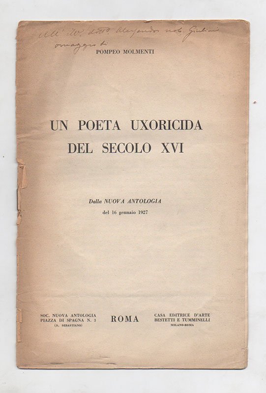 LIBROPrima edizione.CON AUTOGRAFO.Segni del tempo e piccolo restauro alla brossura, per il resto un ottimo esemplare. Invio autografo dell’autore.Raro estratto dalla «Nuova Antologia» del 16 gennaio 1927. Studio su Pietro Massolo, poeta veneziano di estrazione nobile che uccise la moglie Chiara Tiepolo e si fece monaco per sfuggire alla pena capitale.