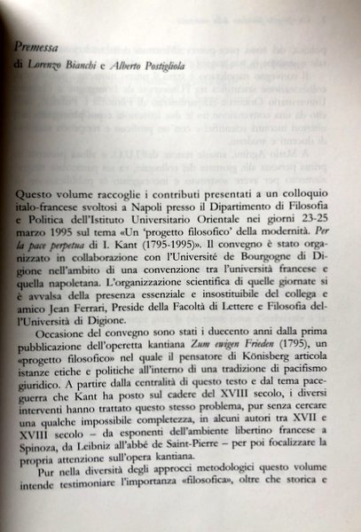 Soggetti: Etica, Politica, Filosofia politica, Illuminismo, Diritto internazionale, Diritto pubblico, Montesquieu, Morale, Guerra, Cosmopolitico, Critica del giudizio, Metafisica dei costumi, Basilea, Pace perpetua, Potere, Diritto dei popoli, Rivoluzione francese, Rousseau, Contratto sociale, Corso meccanico, Pacifismo, Cosmopolitismo, Cittadinanza, Democrazia, Teorie, Ideologie politiche, Idealismo tedesco, Germania, Pensatori moderni, Stato, Concezione, Diplomazia, Nazioni, Antologie critiche, Rassegne, Riferimento, Bibliografia, Scritti politici, Libri Vintage, Fuori catalogo, Saggi, Libri universitari, Zum ewigen Frieden, Settecento, Europa, Saint-Pierre, Libertini, Francia, Opera kantiana, Leibniz, Spinoza, Pascal, Francia, Malebranche, Pufendorf, Montaigne, Mendelssohn, Naudé, Wolff, Vattel, Herder, Conflitti, Guerre, Grecia, Democrazia, Mazzarino, Richelieu, Robinet, Saint-Beuve, Pascal, Descartes, Cartesio, Luigi XIV, Thomas Hobbes, Leviatano, Grozio, Ethics, Politics, Political philosophy, Enlightenment, International law, Public law, War, Cosmopolitics, Critique of judgment, Metaphysics of customs, Basel, Perpetual Peace, Power, Peoples' law, French revolution, Social contract, Mechanical course, Pacifism, Cosmopolitanism, Citizenship, Democracy, Theories, Political ideologies, German idealism, Germany, Modern thinkers, State, Conception, Diplomacy, Nations, Critical anthologies, Reviews, Reference, Bibliography, Political writings, Books not in the catalog, Essays, University books, Eighteenth century, Europe, Libertines, France, Kantian Works, France, Conflicts, Wars, Greece, Democracy, Pascal, Louis XIV, Leviathan, Grotius,