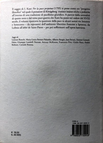 Il saggio di Immanuel Kant Per la pace perpetua (1795) si pone come un “progetto filosofico” nel quale il pensatore di Königsberg riunisce istanze etiche e politiche all'interno di una tradizione di pacifismo giuridico. A partire dalla centralità di questo testo e dal tema pace-guerra che Kant ha posto sul cadere del XVIII secolo, il volume ripercorre la questione della pace in alcuni autori tra Seicento e Settecento – da esponenti dell’ambiente libertino francese a Spinoza, da Leibniz all’abbé de Saint-Pierre – per poi soffermarsi sull'opera kantiana.