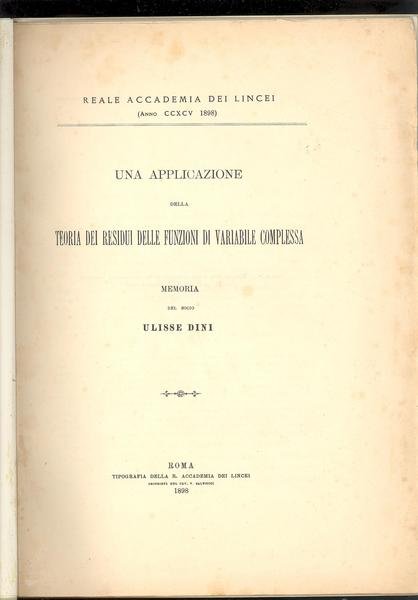 IN 4, pp.53, COPERTINA RECENTE IN BROSSURA A RAMAGE MUTA. MEMORIA DI ULISSE DINI<BR> IN CUI DIMOSTRA CHE CON LA TEORIA DEI RESIDUI, SI POSSONO TROVARE ALCUNI INTEGRALI CHE COMPRENDONO COME CASO PARTICOLARE QUELLO DI JACOBI INSIEME A MOLTI ALTRI DELLA TEORIA DELLE FUNZIONI SFERICHE. MEMORIA DELLA REALE ACCADEMIA DEI LINCEI ( ANNO CCXCV 1898 ). OTTIMA CONSERVAZIONE, PARZIALMENTE INTONSO.ID 4402