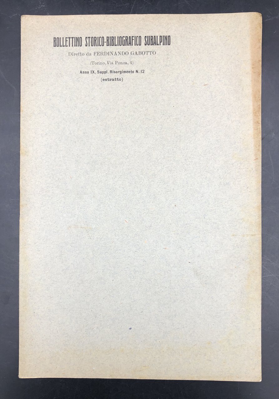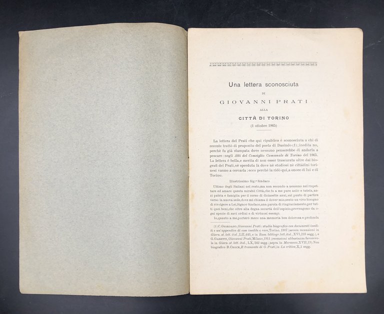 Una LETTERA SCONOSCIUTA di Giovanni PRATI alla città di TORINO (1 ottobre 1865). Estratto originale dal Boll. Storico-Bibliogr. Subalp., a IX, Suppl. Risorgimento n. 12 [deplorante il trasferimento della Capitale a Firenze].