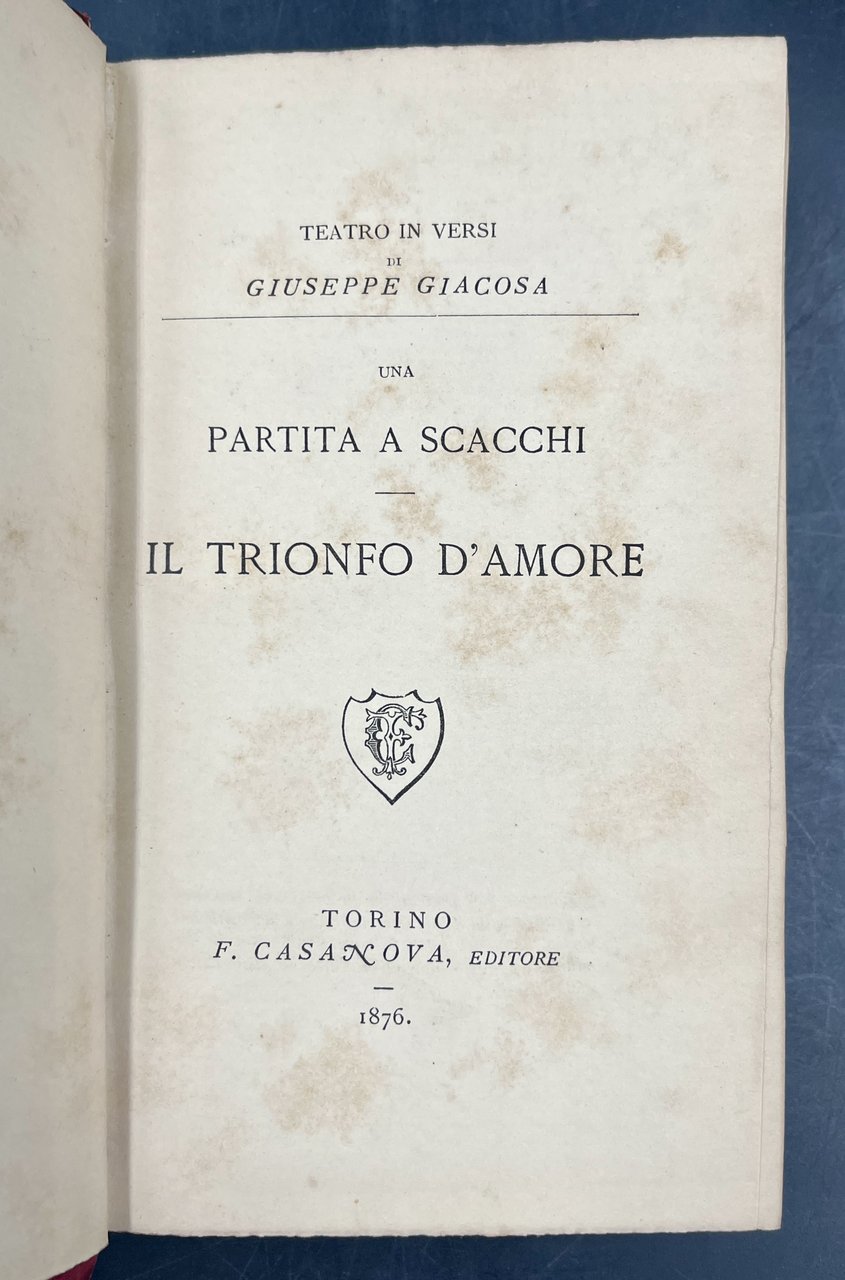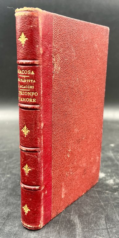 In-16° (cm.16x9,5); pp.[4],168,[3] su carta forte a mano. Ottima LEGATURA coeva in mezzo marocchino rosso, piatti ben coordinati in pregevole tela granulosa rossa, tit. e fregi oro al dorso a 4 nervi, sguardie in lucida carta decorata pettinata. Prima di quattro edizioni dello stesso anno presso questo editore. "Una partita a scacchi" fu pubblicata per la prima volta nel fasc. di marzo 1872 nella «Nuova Antologia», vol. XIX, p.[613]-632; poi in: "Scene e commedie", Torino, L. Beuf (C. Favale), 1873. Bellesemplare marginoso.